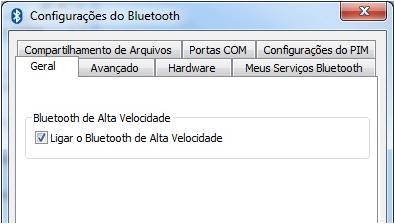 Bluetooth de alta velocidade pode ser ativado ou desativado na guia Geral da janela Configurações de Bluetooth: