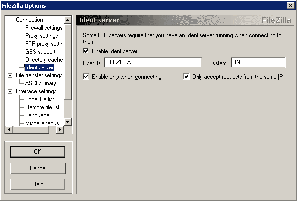 Some servers require their users to have an ident server running as additional authentication method. FileZilla comes with an built-in ident server which can be enabled on the Ident server page.
