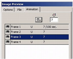 - To set the frame delay, select the desired frame in the list and enter the delay time in hundredths of a second in the Frame Delay field.