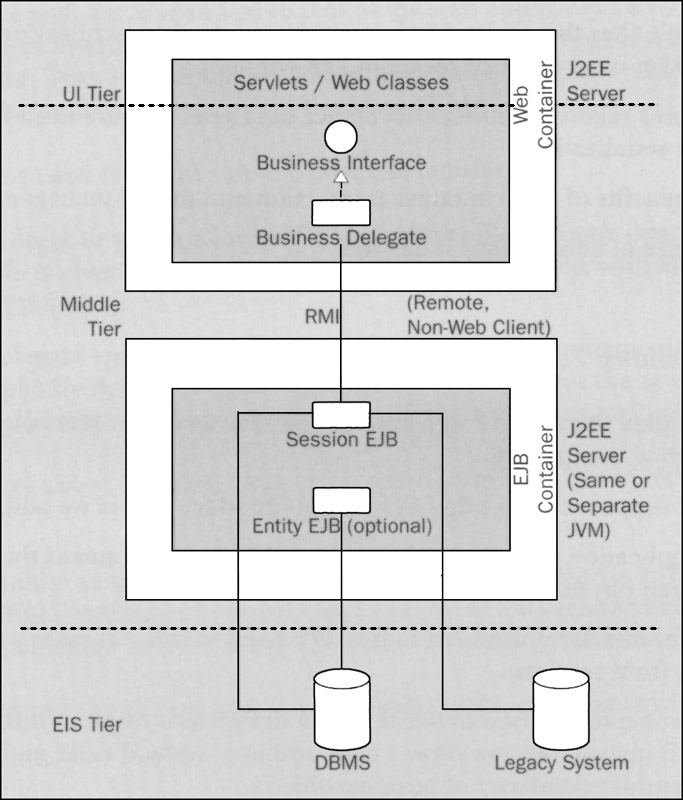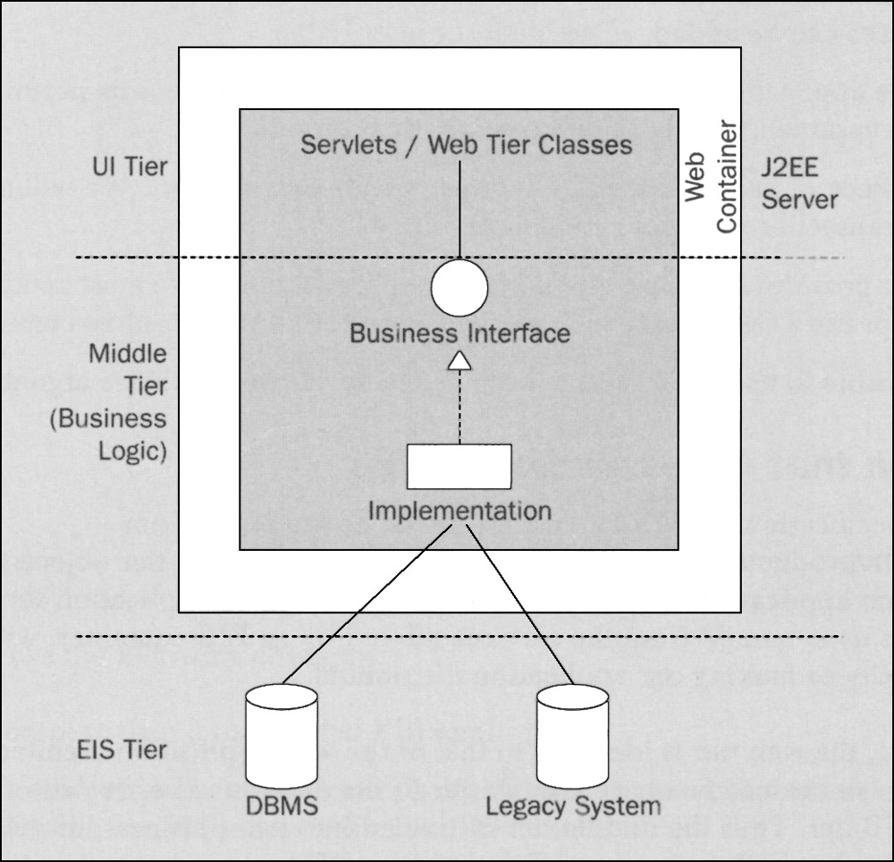 In most cases, J2EE is used to build web apps. Thus, a J2EE web container can provide the entire infrastructure required by many apps. J2EE web apps enjoy virtually the same access to enterprise APIs as EJBs. They benefit from the J2EE server's transaction management and connection pooling capabilities and can use enterprise services such as JMS, JDBC, JavaMail, and the Java Connector API. All data access technologies are available with the exception of entity beans. The web tier and middle tier of a web app run in the same JVM. However, it is vital that they are kept logically distinct. The main design risk in web apps is that of blurred responsibilities between UI components and business logic components. The business interface layer will consist of Java interfaces implemented by ordinary Java classes. This is a simple yet scalable architecture that meets the needs of most apps. The following diagram illustrates this design. The dashed horizontal lines indicate the divisions between the app's three tiers: