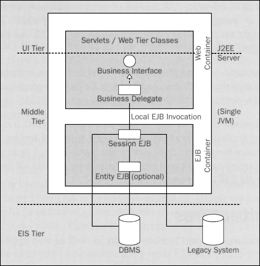 The Servlet 2.3 specification (SRV.9.11), which can be downloaded from http://java.oracle.com/products/servlet/download.html, guarantees web-tier objects access to EJBs via local interfaces if an app is deployed in an integrated J2EE app server running in a single JVM. This enables us to benefit from the services offered by an EJB container, without incurring excessive complexity or making our app distributed. In this architecture, the web tier is identical to that of the web app architecture we've just considered. The business interfaces are also identical; the difference begins with their implementation, which faces the EJB tier. Thus the middle tier is divided into two (business interfaces running in the web container and EJBs), but both parts run within the same JVM. Two approaches can be used to implement the business interfaces: