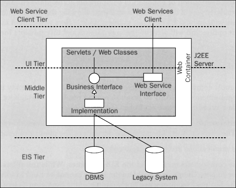 This architecture supports only a web interface. For example, it cannot support standalone GUI clients. (The middle tier is in the same JVM as the web interface.) However, a layer of web services can be added, as we shall see later.