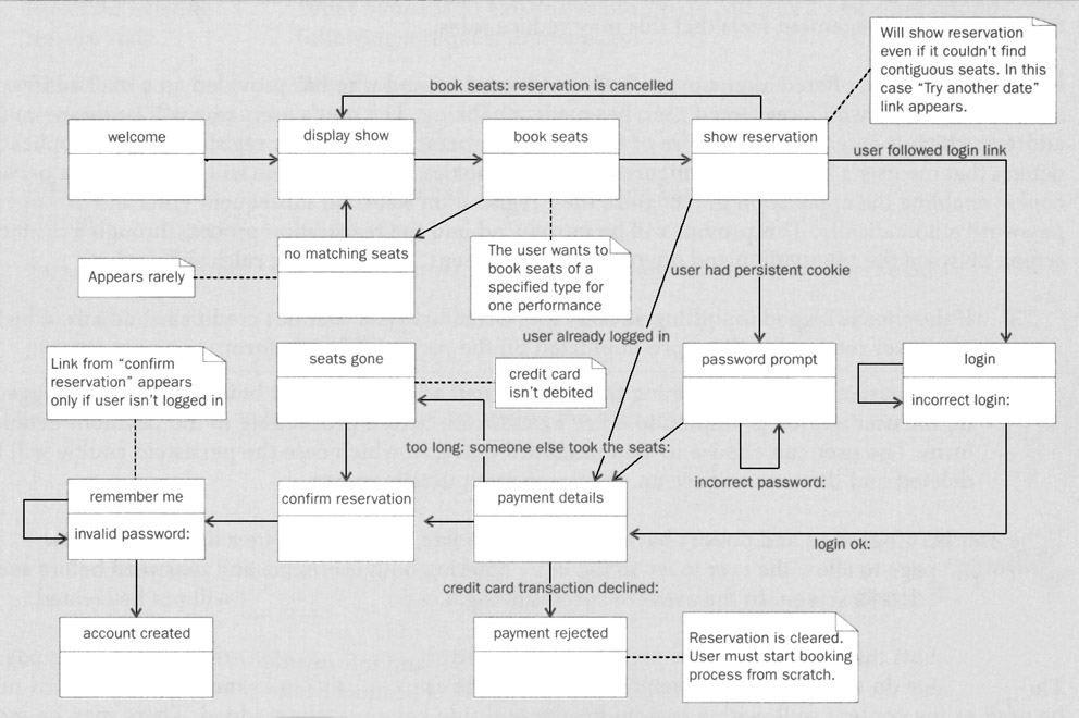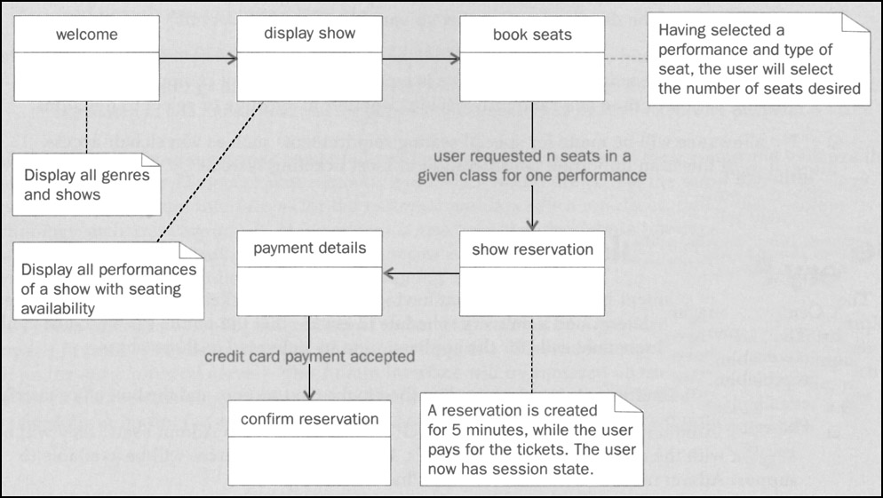 Although I've used UML state diagram graphics, each box represents a screen presented to a user successfully choosing a performance and purchasing a number of tickets, rather than a state. The following diagram shows an Internet user successfully tutorialing seats:
