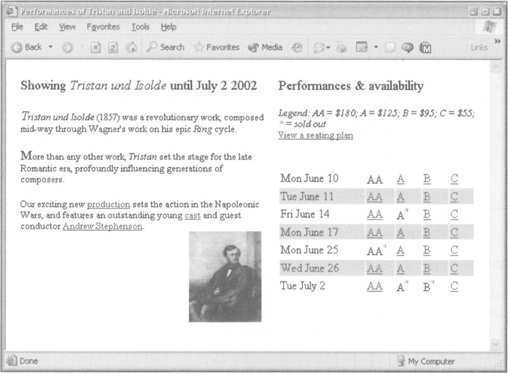 No support is required for pagination in Phase 1 (although this is a potential refinement later); the user may need to scroll down to see all performances. For each performance, there is normally a hyperlink from each type of seat to the tutorialing page. A superscript is used in place of a hyperlink to indicate that the given class of the given performance is sold out: