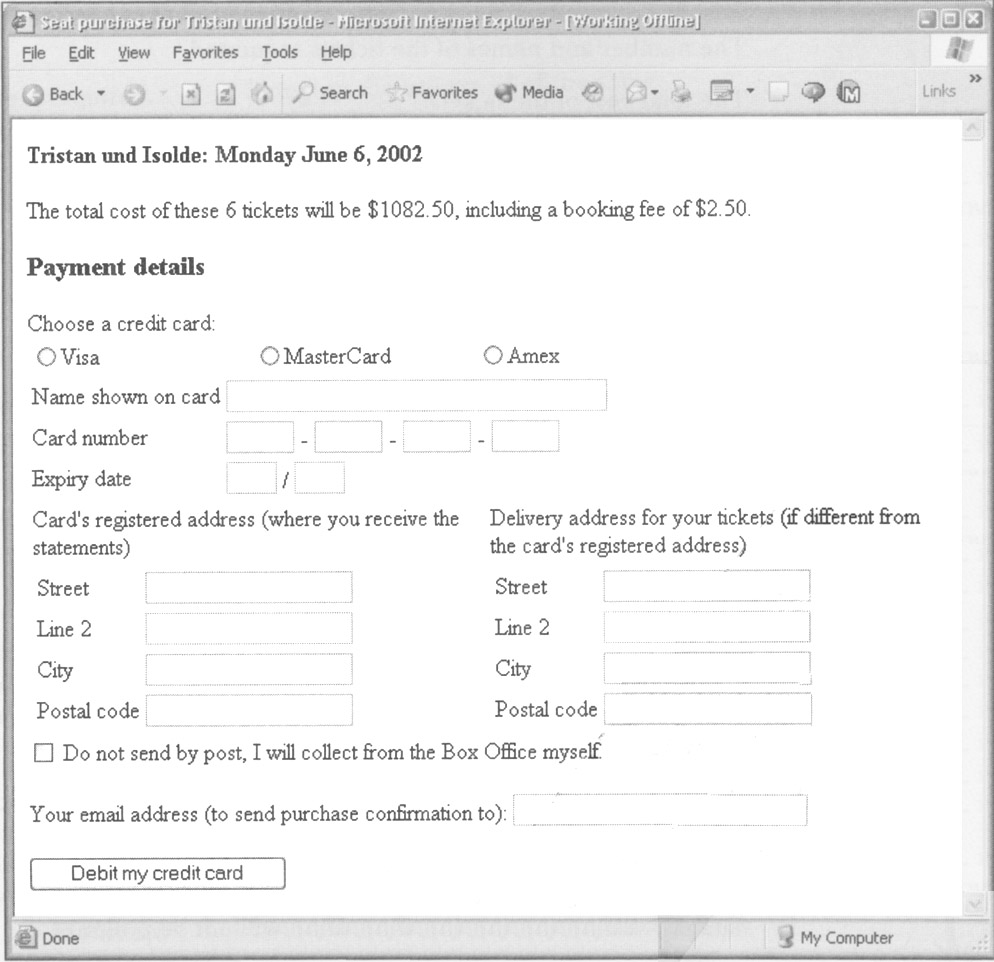 If the user isn't logged in and doesn't have a persistent cookie, there should be a link on the show reservation page to allow the user to try to log in by entering both username and password before seeing the payment details screen. In the event of successful login, a persistent cookie will not be created. The screenshots that follow the table present all the controls and information required on each page. However, they do not fully define the presentation of the app: for example, these screens might be used as the content well, with a custom header and side columns being added. There may be more than one such branding: it is a business requirement that the technical architecture allows this cost-effectively. The discussion of each screen concludes with a summary of the required handling of some common issues with web interfaces, in the following format: