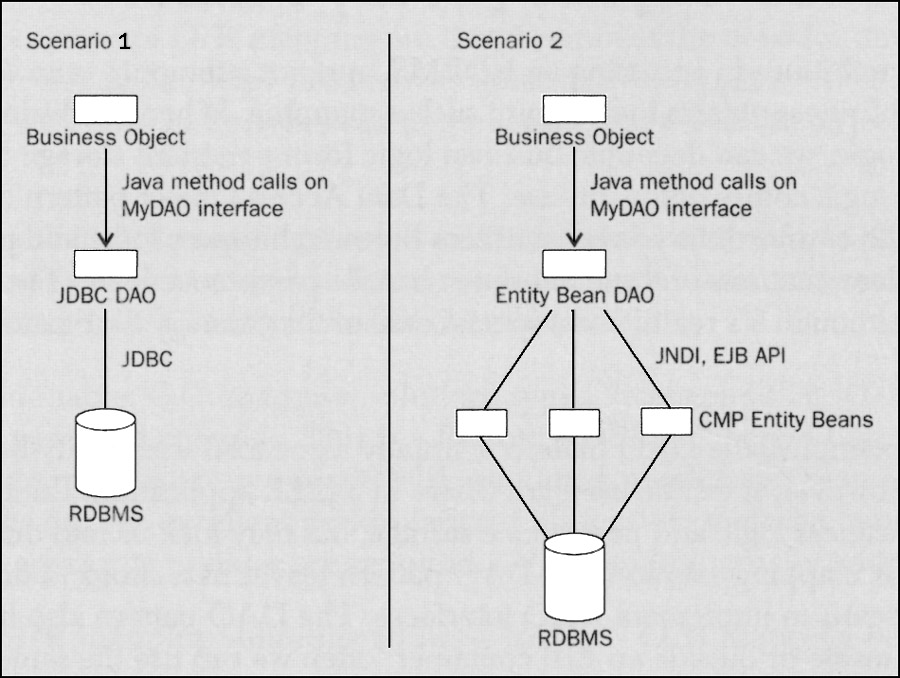 With the DAO pattern the business logic determines the data access interfaces. With O/R mapping there is a risk that the data layer will dictate the working of the business logic layer. This is one of the reasons I'm skeptical about object-driven modeling. I have often seen situations where the modeling of one entity bean per RDBMS table dictates the nature of session bean code and results in excessive complexity. This is the tail wagging the dog: the point of an app is to express business rules, not work with a predetermined and possibly artificial data structure. The following two diagrams illustrate how the DAO pattern can be used to conceal very different data access strategies from a business object Both illustrate the use of a DAO implementing a MyDAO interface. The left hand diagram (Scenario 1) illustrates use of an implementation of this interface that uses JDBC. The right hand diagram (Scenario 2) illustrates use of an implementation that uses a layer of entity beans to abstract access to the RDBMS. Although the resulting architectures look very different, because the business object accesses the DAO through a fixed interface there is no need for changes in business logic to accommodate these two data access strategies.