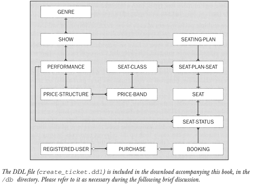 First we must decide what to hold in the database. The database should be the central data repository, but it's not a good place to store HTML content. This is reference data, with no transactional requirements, so it can be viewed as part of the web app and kept inside its directory structure. It can then be modified by HTML coders without the need to access or modify the database. When rendering the web interface, we can easily look up the relevant resources (seating plan images and show information) from the primary key of the related record in the database. For example, the seating plan corresponding to the primary key 1 might be held within the web app at /images/seatingplans/1.jpg. An O/R modeling approach, such as entity EJBs will produce little benefit in this situation. O/R modeling approaches are usually designed for a read-modify-write scenario. In the sample app, we have some reference data (such as genre and show data) that is never modified through the Internet User or Box Office User interfaces. Such read-only reference data can be easily and efficiently obtained using JDBC; O/R approaches are likely to add unnecessary overhead. Along with accessing reference data, the app needs to create tutorialing records to represent users' seat reservations and purchase records when users confirm their reservation. This dynamic data is not well suited to O/R modeling either, as there is no value in caching it. For example, the details of a tutorialing record will be displayed once, when a user completes the tutorialing process. There is little likelihood of it being needed again, except as part of a periodic reporting process, which might print and mail tickets. As we know that the organization is committed to using Oracle, we want to leverage any useful Oracle features. For example, we can use Oracle Index Organized Tables (lOTs) to improve performance. We can use PL/SQL stored procedures. We can use Oracle data types, such as the Oracle date type, a combined date/time value which is easy to work with in Java (standard SQL and most other databases use separate date and type objects). Both these considerations suggest the use of the DAO pattern, with JDBC as the first implementation choice (we'll discuss how to use JDBC without reducing maintainability in ). JDBC produces excellent performance in situations where read-only data is concerned and where caching in an O/R mapping layer will produce no benefit. Using JDBC will also allow us to make use of proprietary Oracle features, without tying our design to Oracle. The DAOs could be implemented using an alternative strategy if the app ever needs to work with another database. The following E-R diagram shows a suitable schema: