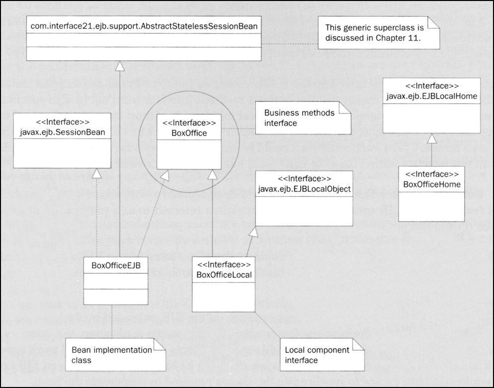Fortunately, there is a simple and effective solution, which is widely recognized: to have both component interface and bean implementation class implement a common "business methods" interface. The business methods interface does not extend any EJB infrastructure interfaces, although it may extend other app business interfaces. If we're dealing with an EJB with a remote interface, each method in the business methods interface must be declared to throw javax.remote.RemoteException. In the case of EJBs with remote interfaces, the business methods interface is normally an EJB-tier implementation detail: clients will work with the bean's remote interface, not the business methods interface. In the case of EJBs with a local interface, the business method interface's methods may not throw RemoteException, which means that the business methods interface need not be EJB-specific. Often the business methods interface, rather than the EJB's local interface, is of most interest to clients of the EJB. In the sample app, for example, the com.wrox.expertj2ee.ticket.boxoffice.BoxOffice interface is an ordinary Java interface, which could be implemented without using EJB. Clients invoke methods on this interface, rather than the EJB's local interface, which extends it. Use of a "Business Methods Interface" isn't really a design pattern – it's more a workaround for an inelegant feature of the EJB specification. But as it's often referred to as a pattern, I'm following established terminology. Let's look at how we use this pattern for the sample app's BoxOffice EJB, and the naming conventions used. Using this pattern involves the following four classes for the EJB: