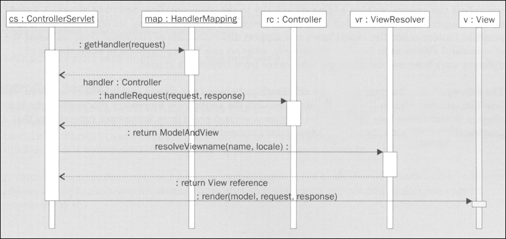 Let's look at how this framework supports basic MVC control flow. The control flow is more similar to that of Struts than the other frameworks I've described, although the view management approach is closer to that of Maverick. Incoming requests are handled by a single generic controller servlet, to which all app URLs are mapped in web.xml. This controller servlet uses its own mappings from incoming requests (not necessarily URL-based, although the default mapping is URL-based) to request controller beans defined in the app context. It's possible to have multiple controller servlets, each with a separate configuration file. These will share a root WebappContext, but be otherwise independent. Each app-specific request controller bean is a threadsafe, reusable object like a Struts action. The following sequence diagram illustrates the flow of control (it's actually slightly simplified, but it illustrates the basic concepts). I'll discuss each of the four messages in more detail below, and we'll look at each class and interface in detail later: