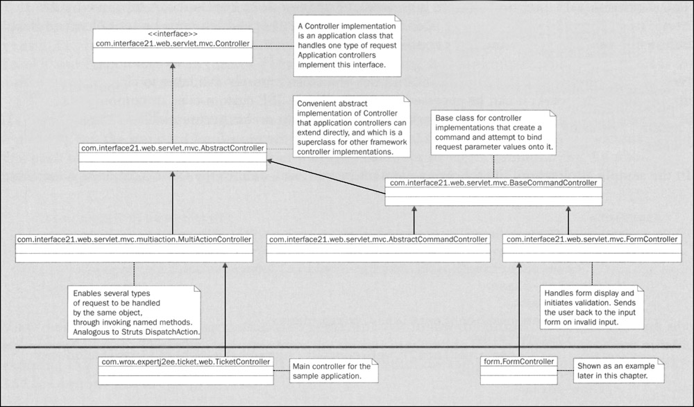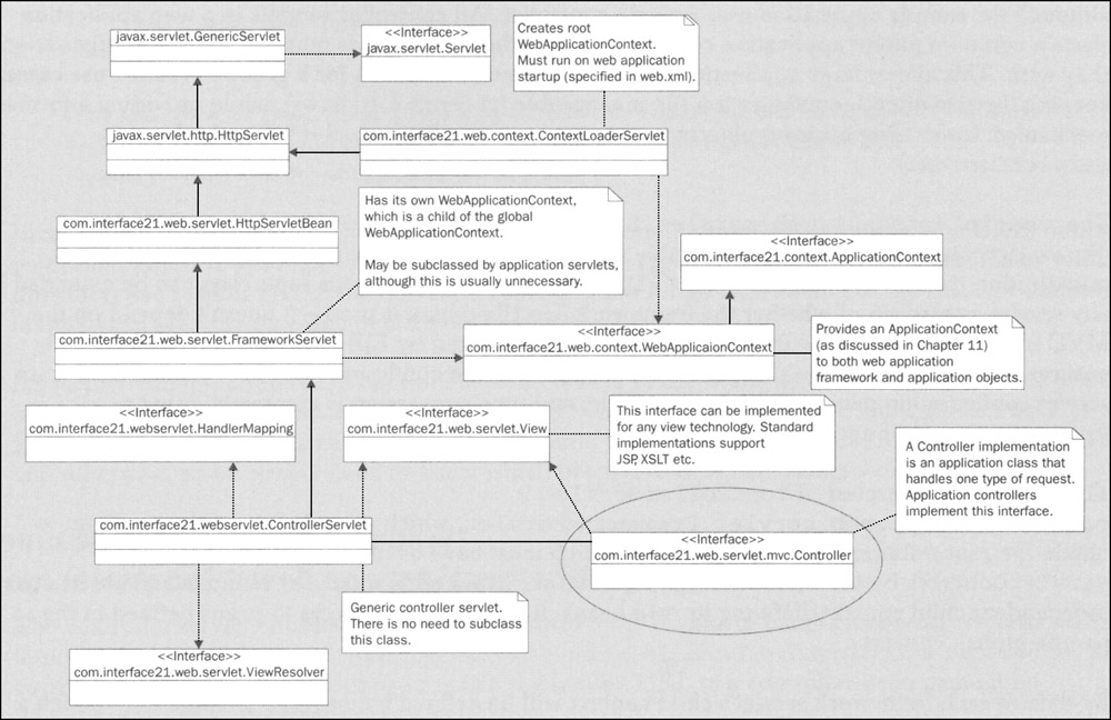 The com.interface21.web.servlet.mvc.Controller interface, circled in the diagram, is implemented by app-specific controllers. In most apps, there is no need to implement any of the other interfaces or extend any of the classes shown in the diagram, as the default implementations meet common requirements. Let's now consider each important class and interface in turn.