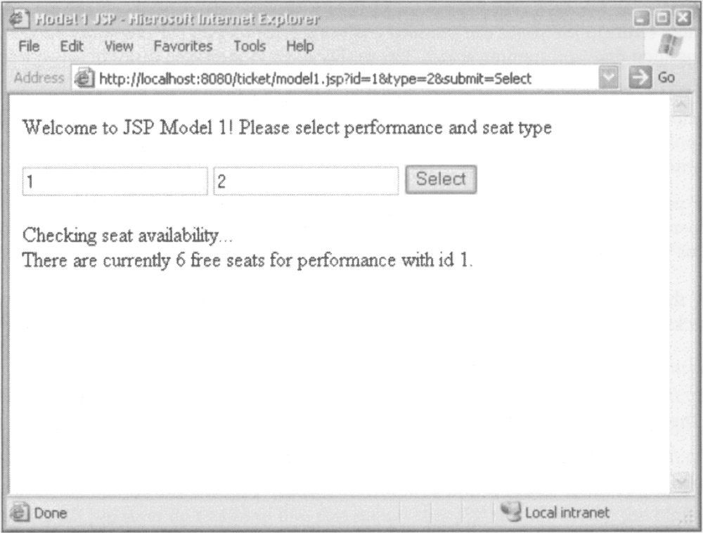 To demonstrate the consequences of misuse of JSP, let's look at an example of a JSP that isn't merely a view, but uses the power of Java to handle incoming requests ("Model 1" style) and uses J2EE APIs. As the control logic behind the "Show Reservation" view would make a JSP Model 1 version too lengthy, I've used a simple page that enables us to query seat availability by performance ID and seat type. A more realistic version of this page would present dropdowns allowing the user to input these values, but for the sake of the example I've neglected this, along with concern about the user entering non-numeric values. This JSP, mode11. jsp, both displays a form allowing the user to input performance and seat type, and processes the result. If the request is a form submission, the number of seats available will be displayed below the form; otherwise just the form will be displayed. The output of this page will look as follows: