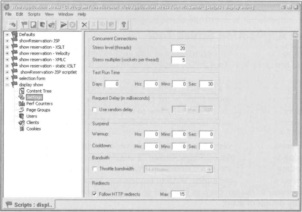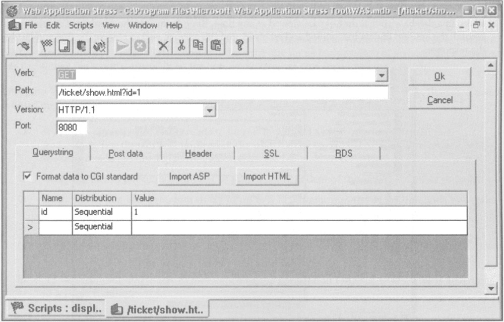There are many tools for testing the performance of web apps. My preferred tool is Microsoft's free Web app Stress (WAS) Tool (http://webtool.rte.microsoft.com/). For a platform-neutral, Java-based alternative, consider Apache JMeter (available at http://jakarta.apache.org/jmeter/index.html) or the Grinder (discussed below). However, these tools are less intuitive and harder to set up. Since it's generally best to run load testing software on a separate machine to the app server, there is usually no problem in finding a Windows machine to run the Microsoft tool. Configuring Microsoft's WAS is very easy. It simply involves creating one or more scripts. Scripts can also be "recorded" using Internet Explorer. Scripts consist of one or more definitions of app URLs to be load-tested, including GET or POST data if necessary. WAS can use a range or set of parameter values. The following screenshot illustrates configuring WAS to request the "Display Show" page in the sample app. Remember to change the port from the default of 80 if necessary for each URL. In this example, it is the JBoss/Jetty default of 8080: