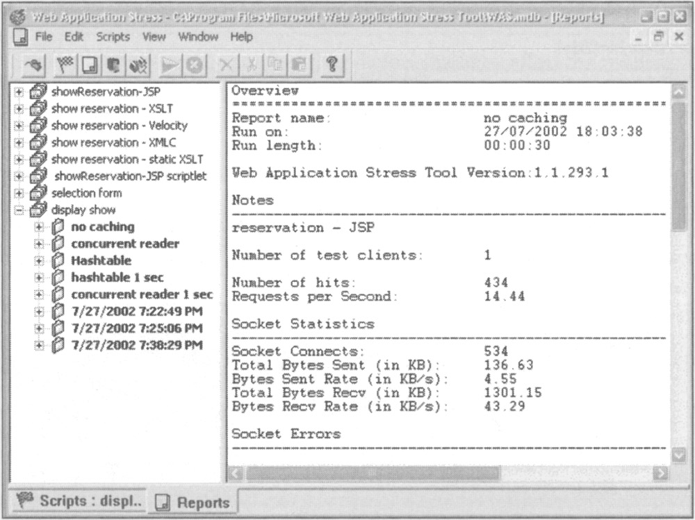 Once a script has been run, reports can be viewed via the Reports option on the View menu. Reports are stored in a database so that they can be viewed at any time. Reports include the number of requests per second, the amount of data transmitted and received, and the average wait to receive the first and last byte of the response: