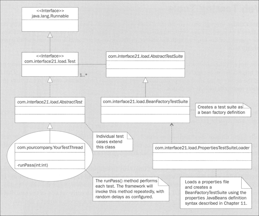 It enables a number of test threads to be run in parallel as part of a test suite. In this framework, test threads will implement the com.interface21.load.Test interface, while the test suite is usually a generic framework class.