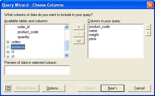 Next you will see the Query Wizard. This enables you to select the columns to pull through into your spreadsheet. As a simple example, simply select all the columns from the products table by selecting products and pressing the > button. The result is shown in Figure 22.6.
