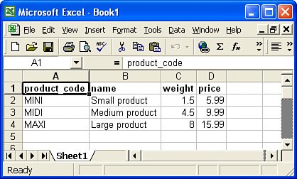After the final step of the wizard, press the Finish button. You are asked to select a location in the spreadsheet for the data to be insertedjust select the default location, which is the top-left cell, assuming that you started with a blank worksheet. Figure 22.7 shows the result: an Excel spreadsheet containing the contents of the products table.
