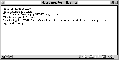 Figure 3.3. Whatever the user enters into the HTML form will be printed out to the Web browser by the HandleForm.php script (see Figure 3.4).