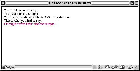 Another benefit to using PHP to handle HTML forms is that data is automatically escaped in transit. For example, if I thought "form.html" was too simple! was entered as the comment, the $Comments variable will be equal to I thought \"form.html\" was too simple! so that it may be printed without complication (Figure 3.5).