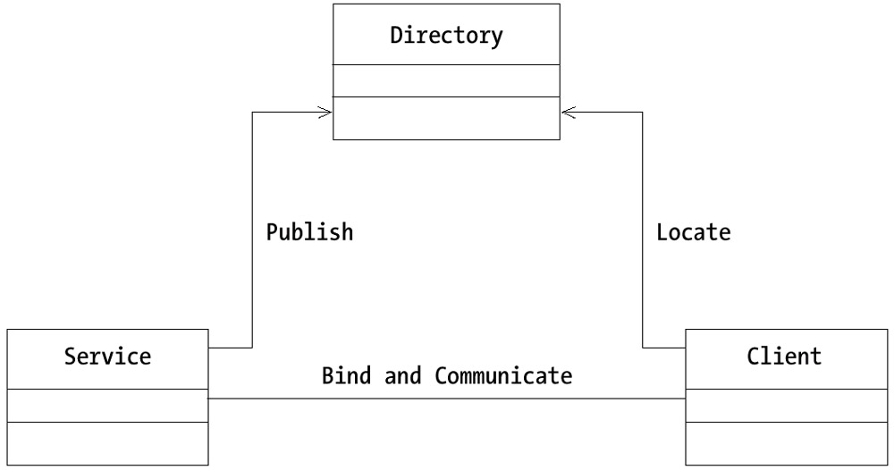 The three types of components in the service-oriented architecture divide responsibilities between services and clients to services. The directory facilitates physical separation between the client and the service. The three components are as follows:
